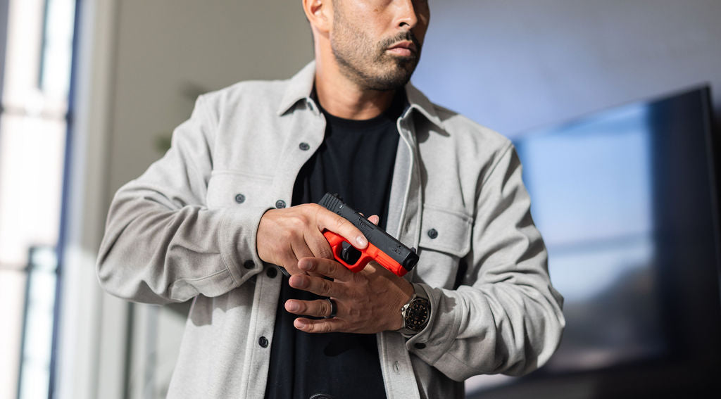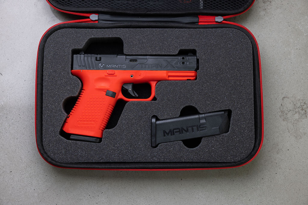The Titan X is a dry-fire training pistol that features a Glock 19-style frame for a familiar and popular grip, as well as holster compatibility. The Titan X Laser Pistol features a unique trigger-reset design that allows you to do long strings of dry fire shots without the need to rack the slide on a real firearm, as with the older Mantis Laser Bullet.