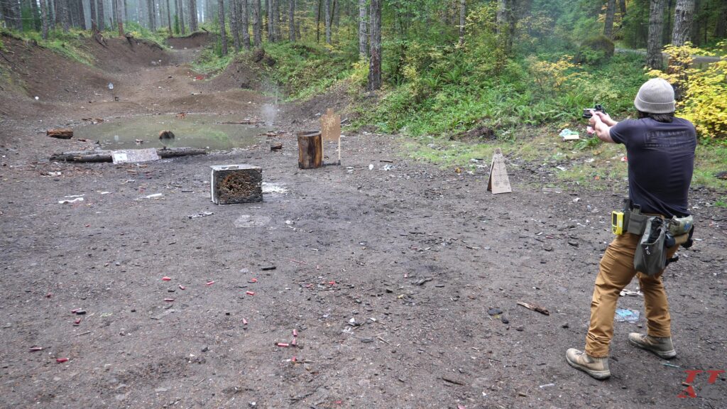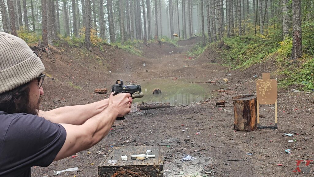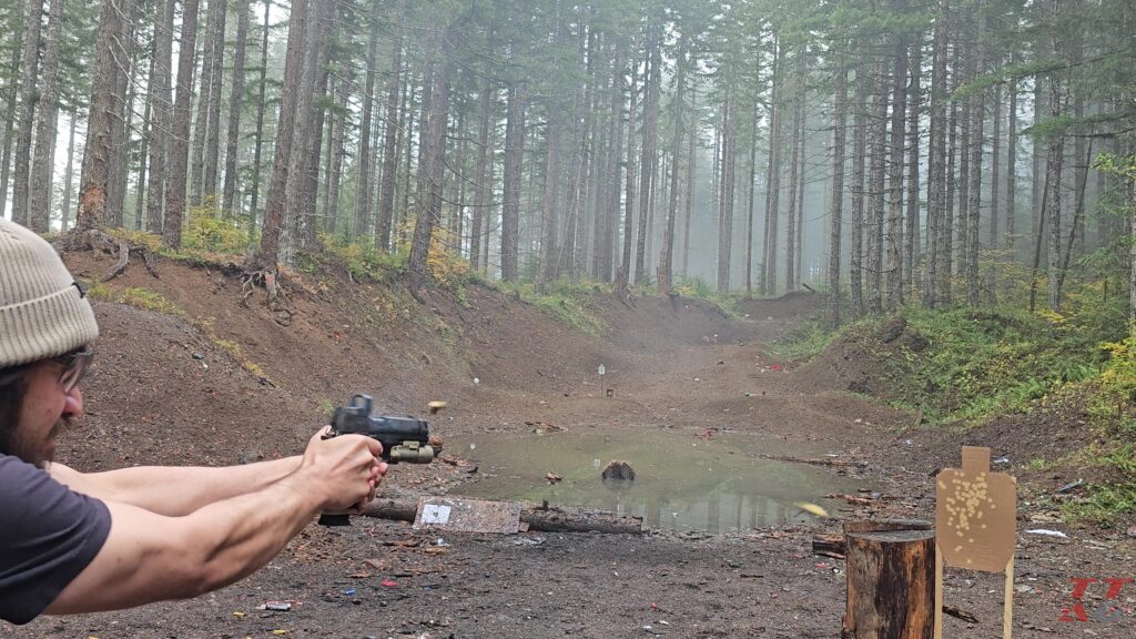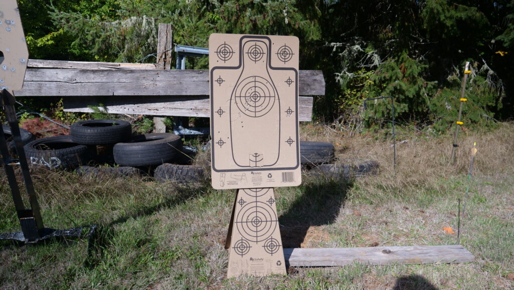 I once again have been using the Re-Nine safety targets system for these drills, mixed in with barely used official USPSA targets I find discarded at the range (great way to save money!). This time, instead of a cardboard stand, I’m using one of their Compact 1×2 target stands to hang their silhouette target.