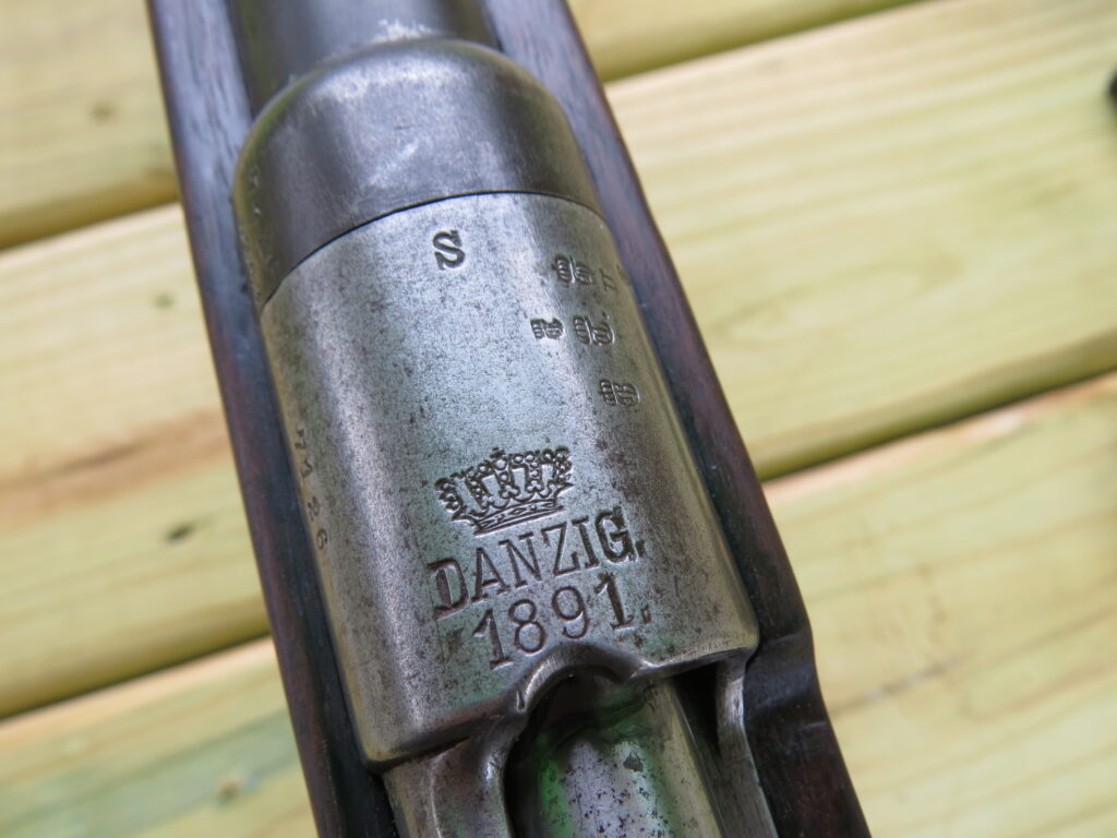 My rifle appears to be one of the 88/05s sent to Turkey. It was built at the Danzig Arsenal in 1891. This specimen shows the telltale S over the chamber, stripper clip guides, thumb cut, and a modified magazine with the stamped sheet-metal cover. The rear sight is stamped in Arabic characters, and a crescent moon marks the bolt handle. Serial numbers on the parts are a mismatched jumble. That’s typical of rifles that cycled through Turkish arsenals. There is a plethora of proof stamps showing it was worked on repeatedly.