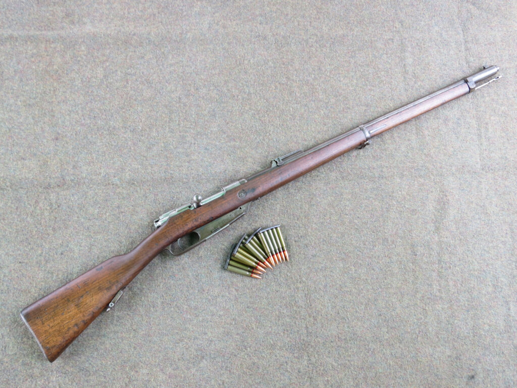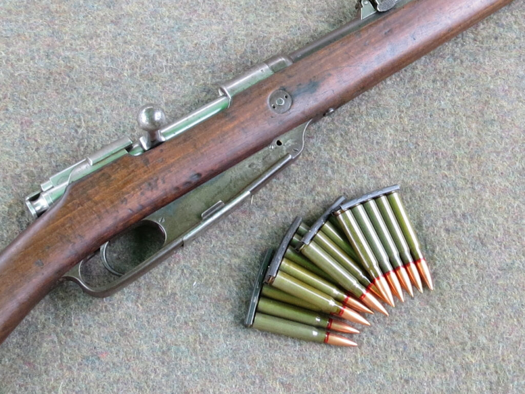 The barrel essentially copied the Lebel profile, and the rifle used a 5-round Mannlicher en-bloc clip fed through the top. Empty clips were ejected through a slot in the magazine floor. Stocks were long, straight, walnut. The rifle’s most distinctive visual trait was a sheet metal barrel shroud that gave the gun a fat, “bull-barreled” look. It was officially accepted into service on November 20, 1888, by Kaiser Wilhelm II.