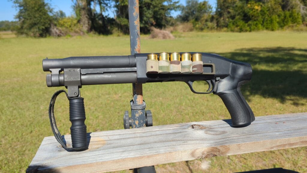 Since I mentioned mini shells, I added the Defender Tactical adapter to make them run reliably. I also added a mini shell from a side saddle from Pew Pew Koncepts to top off Mossberg’s mini monster. To me, mini shells are a fun novelty, but so is this entire gun.