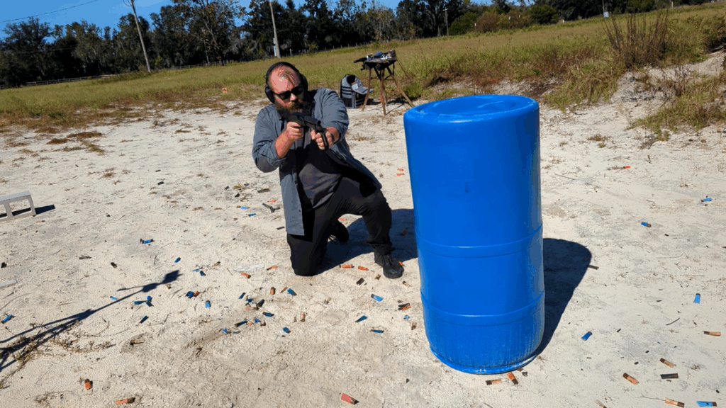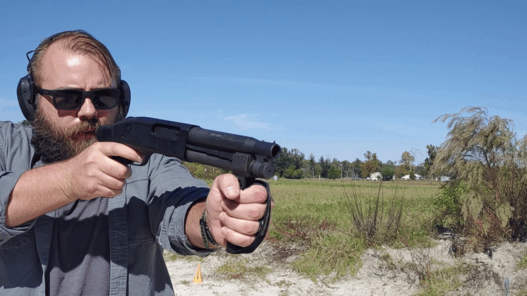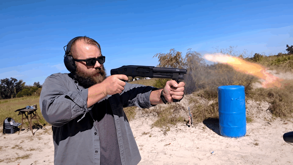 I fired some standard buckshot through the gun; I fired a lot of Fiocchi Defense Dynamics reduced-recoil buckshot. Firing this ammo was a literal and figurative blast. You can actually feel the gas leaving the barrel. With the reduced recoil ammo, recoil wasn’t that bad at all, and I could put two of those Fiocchi rounds on target in about 1.1 seconds. Without a stock, you are going to sacrifice some performance and deal with some recoil.