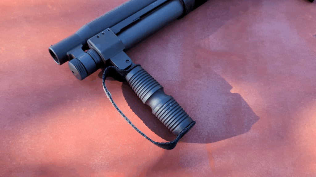 The Compact Cruiser replaces the standard pump with a vertical grip. A traditional pump is just too big to work on this ultra-small gun. It would hit the receiver, preventing the action from cycling. The vertical grip also folds out of the way, making the weapon easy to store and reducing its profile.