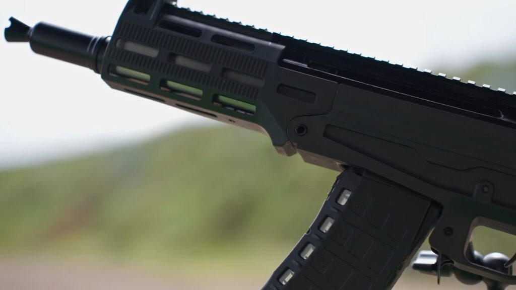 With a cyclic rate of fire estimated between 700 and 850 rounds per minute, the rifle is designed to deliver rapid and reliable performance in close-quarters scenarios, much like a PDW would.