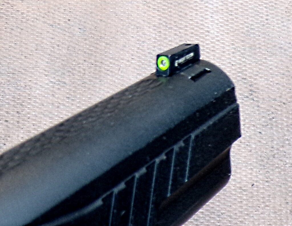 Sights. Even though the gun shot low and a bit right, that could be addressed. The sight picture from the Novak front and rear was excellent. Add in the night-sight front, and the sights were just what was needed.