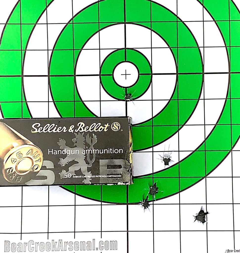 This was at 25 yards. I always seem to have one “flyer”, if you can call it that. All ammo shot low and right for me, but one of our sons shot it, and it did better. I always say I’m not the best shot in the room, and this proves it! I do believe that, given enough time, you would be able to come up with a load that this gun really likes. I only tried three, but of the gazillion .45 loads out there, you’d have to find at least one that grouped well, closer to the point of aim.