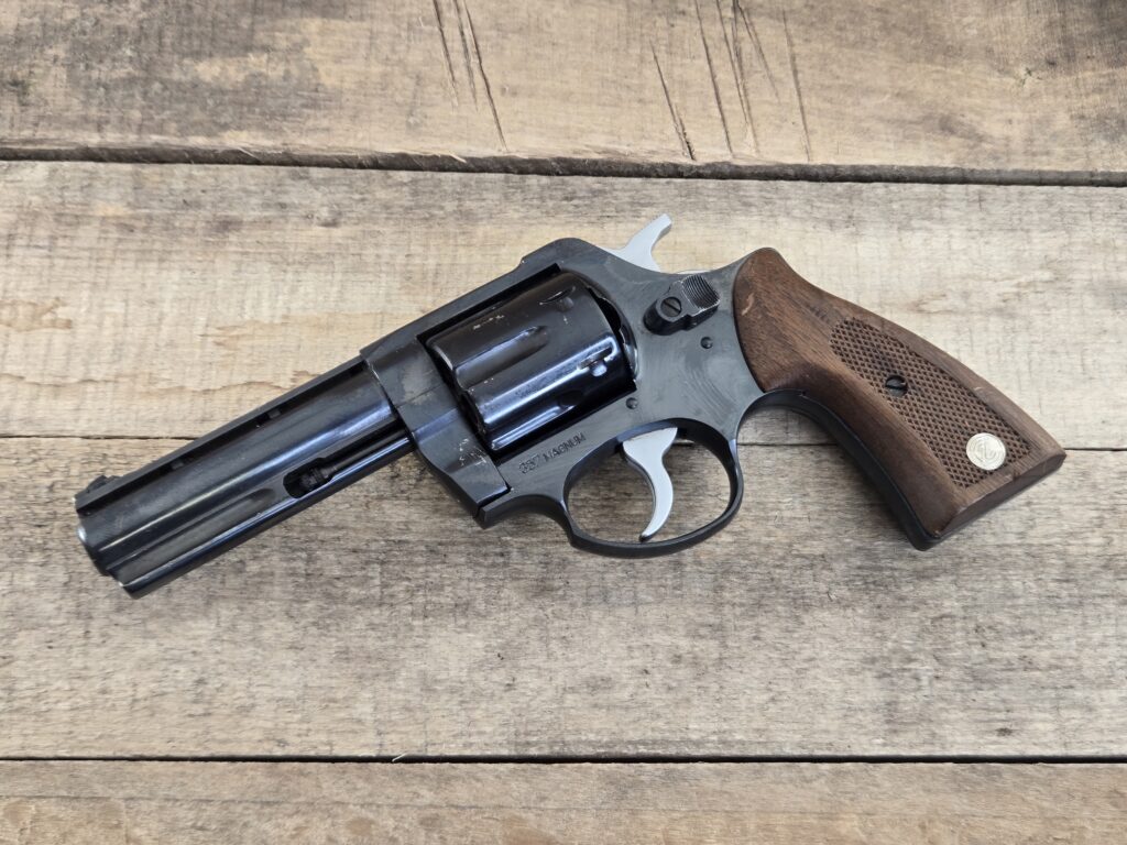 The barrel features a heavy profile and a vent rib. The frame is essentially K frame sized and quite solid. These came in 2-inch and 4-inch barrel versions. My gun is a 4-inch model.